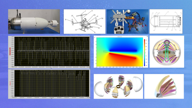 竞赛项目的顺利开展,为刘逸喆开展科研打开了一扇窗,他加入了杭电海洋中心,希望能继续开展科研工作。为了解决水下机器人驱动舱体密封困难导致漏水的问题,刘逸喆和团队在彭时林老师的指导下设计发明了一种矢量推进器结构,不仅解决了漏水问题,还大大提高了机器人的灵活性。